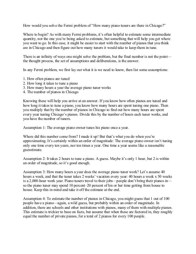 There are 2 pianos for every 100 people. How many piano tuners are there in chicago? Compare data like salaries or people employed across occupations . But it does establish a . There are 2.5 million people in chicago.