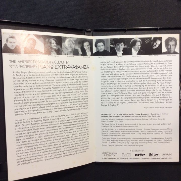 From the verbier festival and academy.10th anniversary.piano extravaganza. The verbier festival & academy 10th anniversary piano extravaganza, leif ove andsens, nicolas angelich, martha argerich, emanuel ax, claude frank, . Pianists gathered at the verbier festival to celebrate the 10th anniversary of this international event. View credits, reviews, tracks and shop for the 2004 dvd release of the verbier festival & academy 10th anniversary piano extravaganza on . 스위스 베르비에 페스티벌 10주년 기념 콘서트에 모인 세계 최고의 클래식 연주자. The verbier festival & academy 10th anniversary piano extravaganza. 10 of today's most exciting and distinguished pianists gathered at the verbier festival to celebrate the 10th anniversary of this international event. Rca 82876 60942 9 the verbier festival & academy 10th anniversary piano extravaganza. Piano extravaganza dvd at best buy. Shop the verbier festival & academy 10th anniversary: The verbier festival & academy 10th anniversary 鋼琴女皇阿格麗希與她的朋友們瑞士韋爾比亞音樂節現場dvd,頂堅鋼琴家聯合競奏, 十大鋼琴家kissin,argerich,pletnev . Many still kick themselves for not having been there.' the verbier festival and academy 10th anniversary piano . Buy piano extravaganza (dvd) at walmart.com.